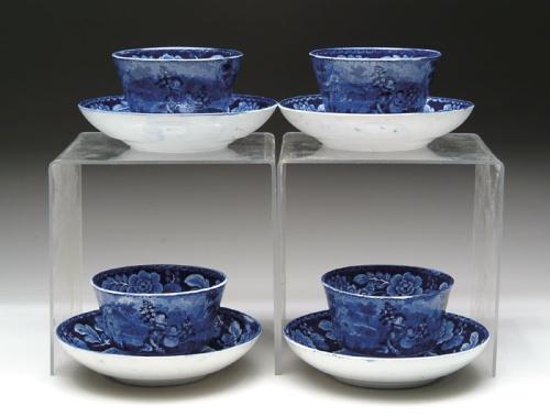 SET OF FOUR STAFFORSHIRE HANDLESS CUPS AND SAUCERS BY DAVENPORT. Blue and white pattern shows children picking flowers in front of cottage and church, flower border. SIZE: Saucers are 5-3/4in. dia; cups are 2-1/2in. h. CONDITION: Very good. 9-25831