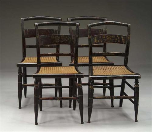 SET OF FOUR STENCIL DECORATED CANE SEAT HITCHCOCK CHAIRS. Black ground with gold stenciling of fruit basket and leaves. PROVENANCE: Weber Estate, Hallowell, Maine. SIZE: 34” h x 18” seat h x 17” across seat. CONDITION: Generally good, some scrapes and wear to paint. 9-27042