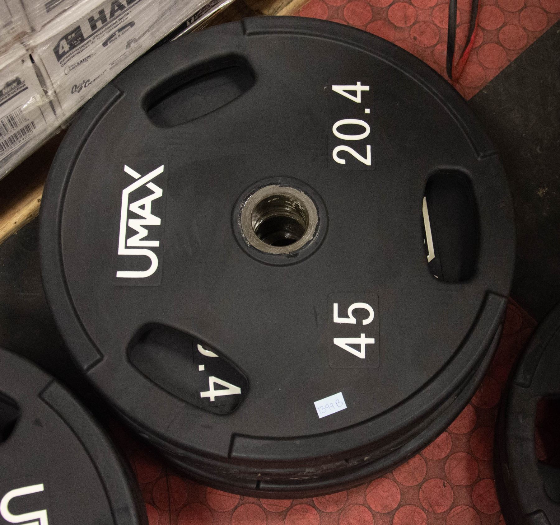 SET OF FOUR UMAX NEOPRENE COATED 45LB PLATES