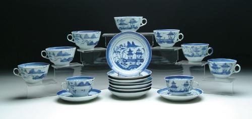 SET OF NINE BLUE AND WHITE CANTON CUPS AND SAUCERS. Assembled set with similar design. Each cup having a loop handle. SIZE: 6in. saucers, 4in. cups. CONDITION: 9-26103