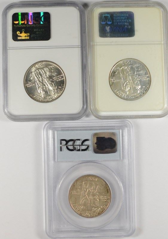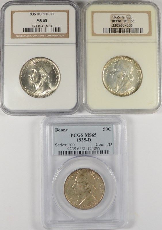 SET OF (P, D, S) 1935 BOONE COMMEN HALF DOLLAR'S NGC/PCGS MS-65