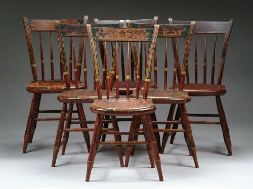 SET OF SIX ANTIQUE PAINTED WINDSOR SIDE CHAIRS SIGNED S. KILBURN. Maker Stephen Kilburn (1787-1867). Worked in the village of New London, Huron County, Ohio in 1840 and listed in the American Cabinet Makers book. Each chair retains its original paint decoration with green and yellow highlights on a red background. Each chair is branded S Kilburn. Typical thumb-back Windsor side chairs. SIZE: 34in. h x 17in. seat h. CONDITION: Structurally very good. Paint has significant wear to decoration but appear to be untouched. 9-26001