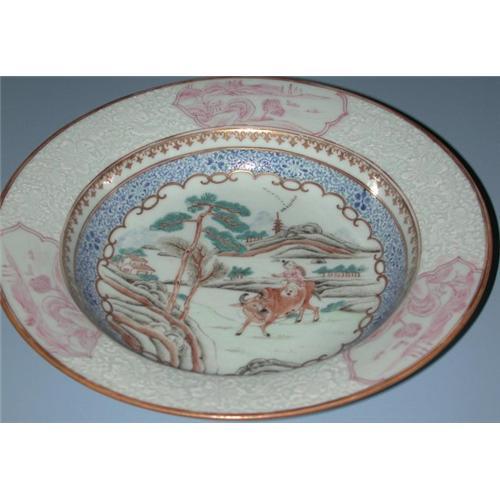 This pattern is referred to as Boy on a Buffalo within a blue enameled border, the rim with pink landscaped borders reserved on a floral scroll in "bianco sopra bianco" enamel. These plates are in AS PERFECT CONDITION with NO RESTORATION--that you will ever find in Chinese Export Porcelain that dates almost 300 Years old. Undoubtely made for the European Market. More images available upon request.
