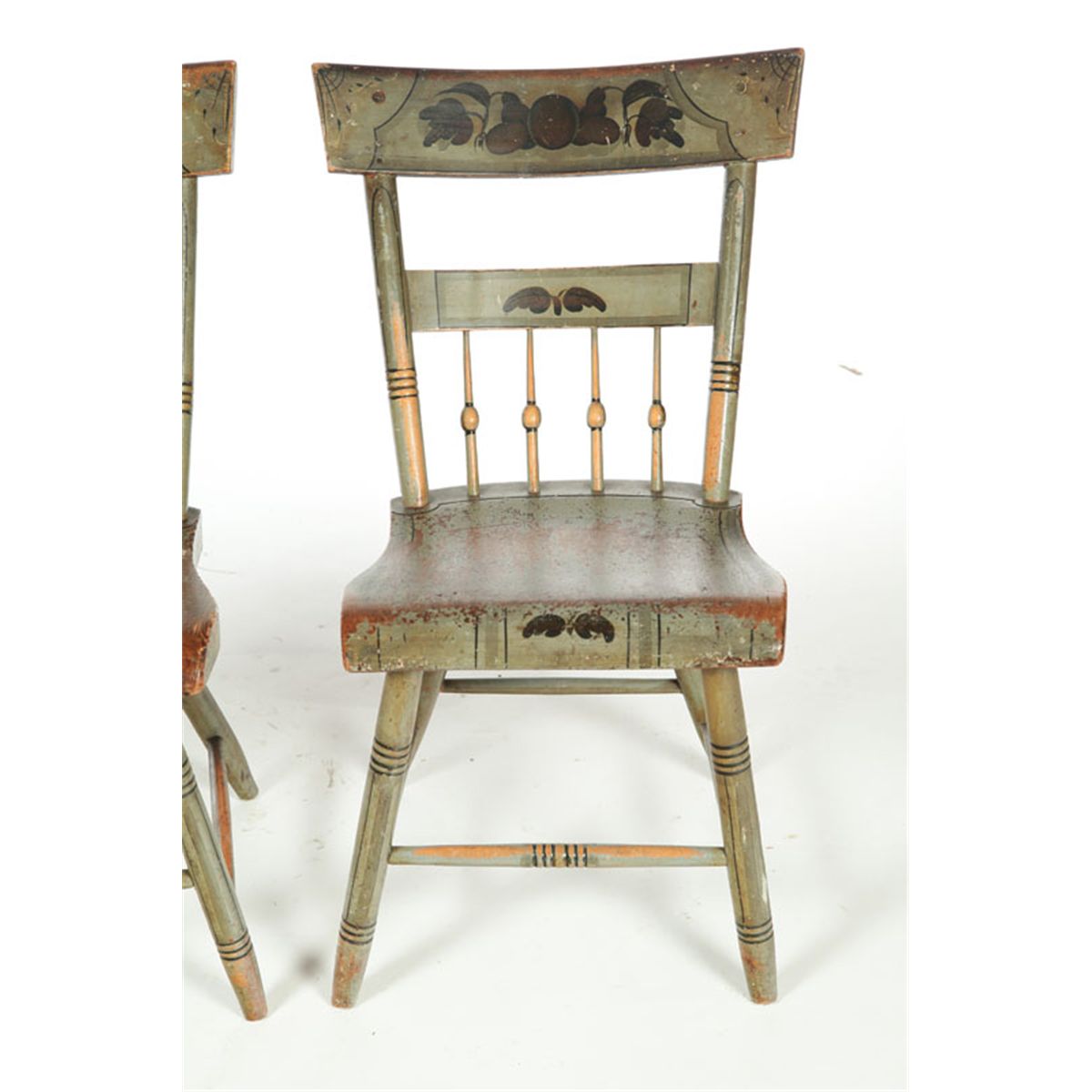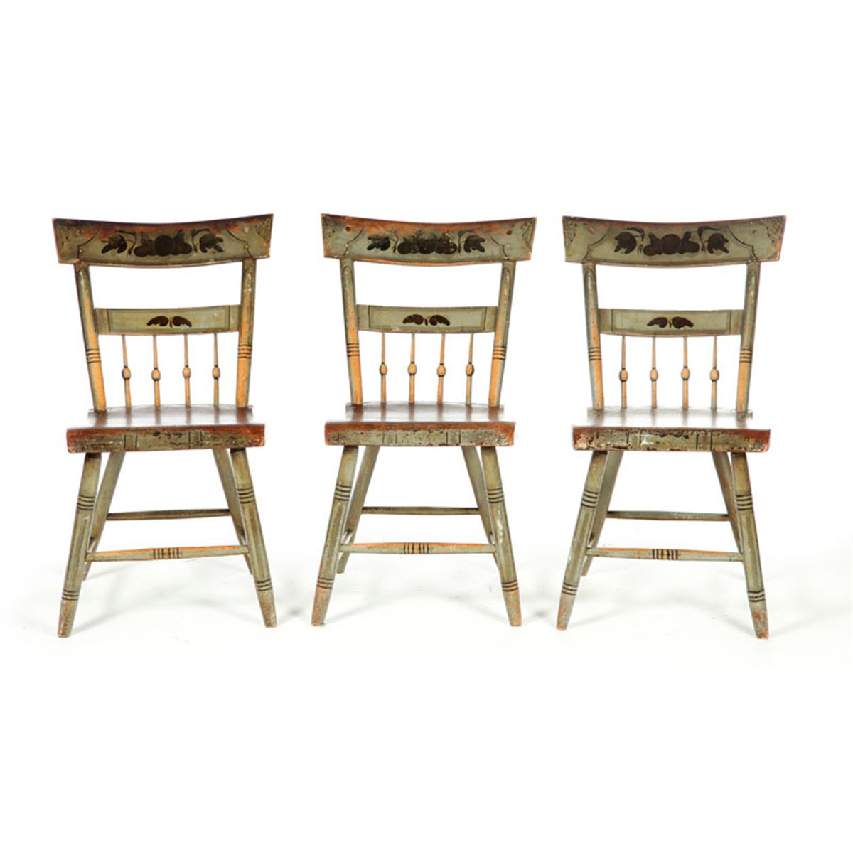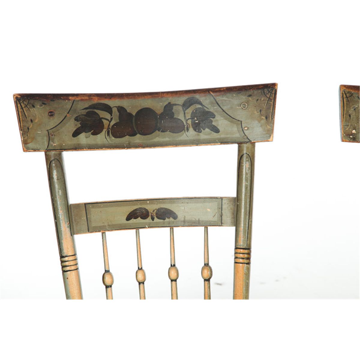 Attributed to Lancaster, Pennsylvania, 1820-1850, mixed woods. Half-spindle Windsors with original fruit decoration against a grey ground. Wear and paint loss. 17 1/4"h. seat, 31 1/2"h. overall.