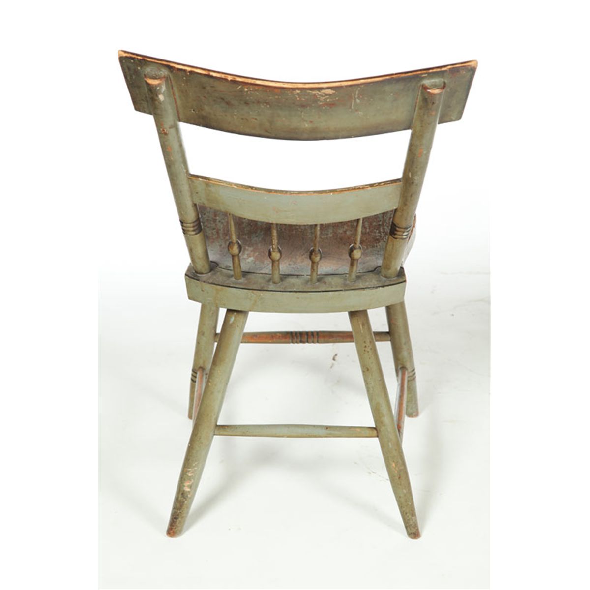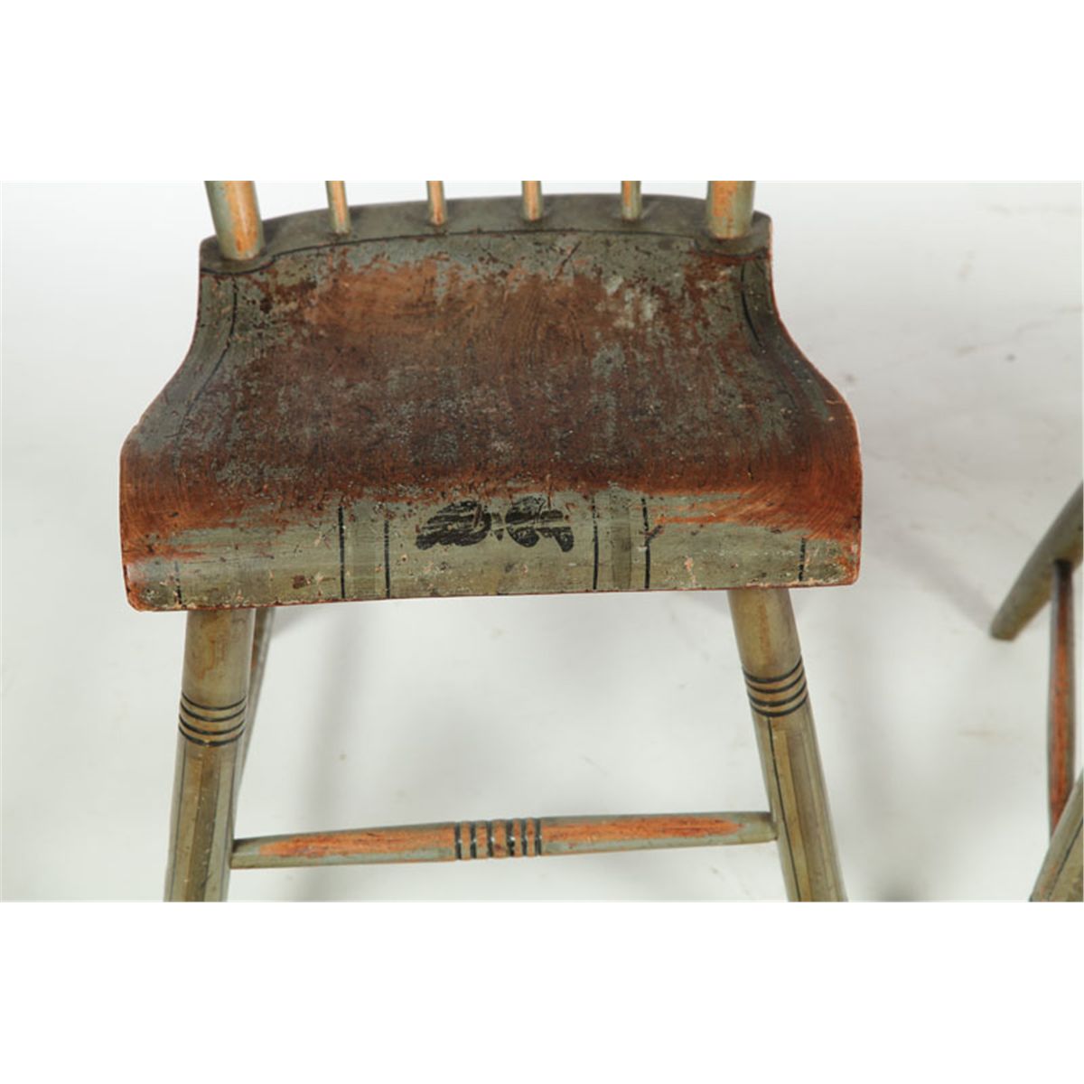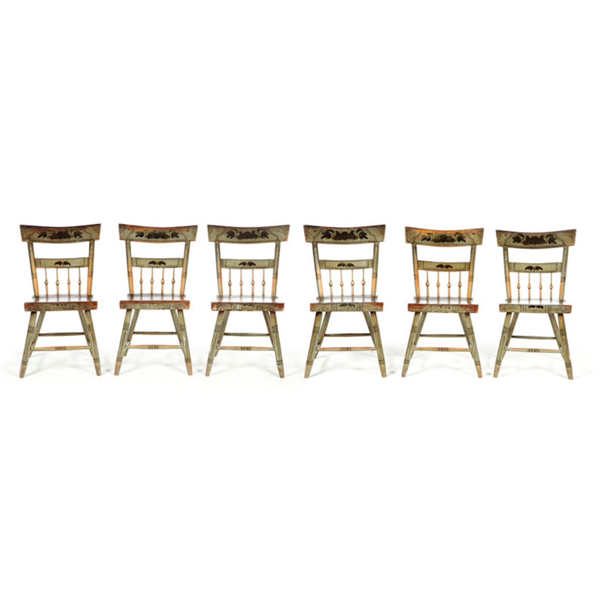 Attributed to Lancaster, Pennsylvania, 1820-1850, mixed woods. Half-spindle Windsors with original fruit decoration against a grey ground. Wear and paint loss. 17 1/4"h. seat, 31 1/2"h. overall.