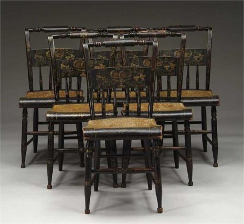 SET OF SIX DECORATED HITCHCOCK CHAIRS. Each having grain painted mustard colored seats, black ground with stencil decoration of flowers and basket of fruit. Some chairs are marked “M. W” in black paint underneath seat. PROVENANCE: Weber Estate, Hallowell, Maine. SIZE: 34” h x 17-1/2” seat h x 16” at widest. CONDITION: Original decoration has some wear in expected areas, structurally sound. Very good. 9-27041