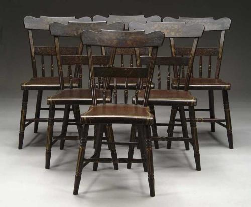SET OF SIX DECORATED PLANK SEAT CHAIRS. Half spindle backs with plank seats. Brown paint with stenciled fruit and leaves with mustard highlights. Chalk inscription to base. Second quarter of the 19th Century, Mid-Atlantic States. SIZE: 32” h x 17-1/2” seat h. CONDITION: Very good. 9-26647