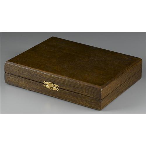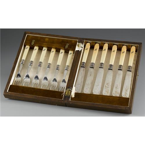 <B>SET OF SIX FISH KNIVES AND FORKS</B></I><BR><BR>Set includes six fish knives and six forks, all of silver with foliate design and marked <I>W & HSiA1,</B></I> and with probably Bakelite handles monogrammed <I>S</B></I> in black. All enclosed within a wooden box<BR><BR> <B>Condition Report:</B> Normal signs of wear as appropriate with age.<BR><BR><b>Shipping:</b> Hollowware/Pottery/Glass, Small (<a target="_blank" href="http://www.heritageauctions.com/common/shipping.php">view shipping information</a>)