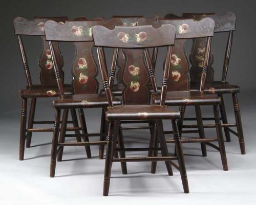 SET OF SIX PAINT DECORATED PLANK SEAT CHAIRS. Brown painted with red and white flower decoration having green leaves. Black and mustard highlights. Single vase shaped splat with carved crest. Nicely carved and shaped seats and box stretcher. One vase back has different flower paint but the remainder is identical. SIZE: 33-1/2” h x 16-1/2” seat h. CONDITION: A nice set in nice old paint with only expected wear. Very good. 9-27609