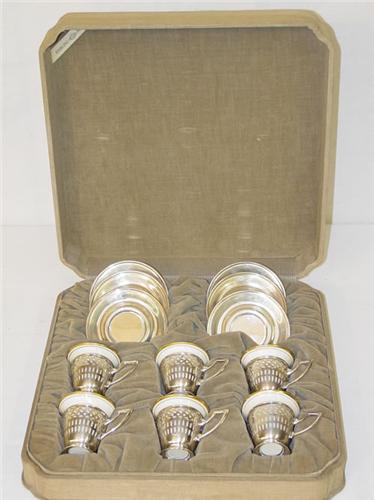SET OF STERLING DEMI CUPS & SAUCERS W/ LENOX INSERTS- WEBSTER MAKER, IN ORIGINAL FITTED BOX - (1) INSERT DAMAGED, NORMAL WEAR TO SILVER