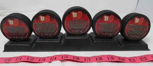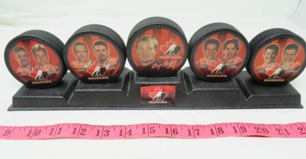 SET OF TEAM CANADA HOCKEY PUCKS WITH STAND (WAYNE GRETZKY, ETC)
