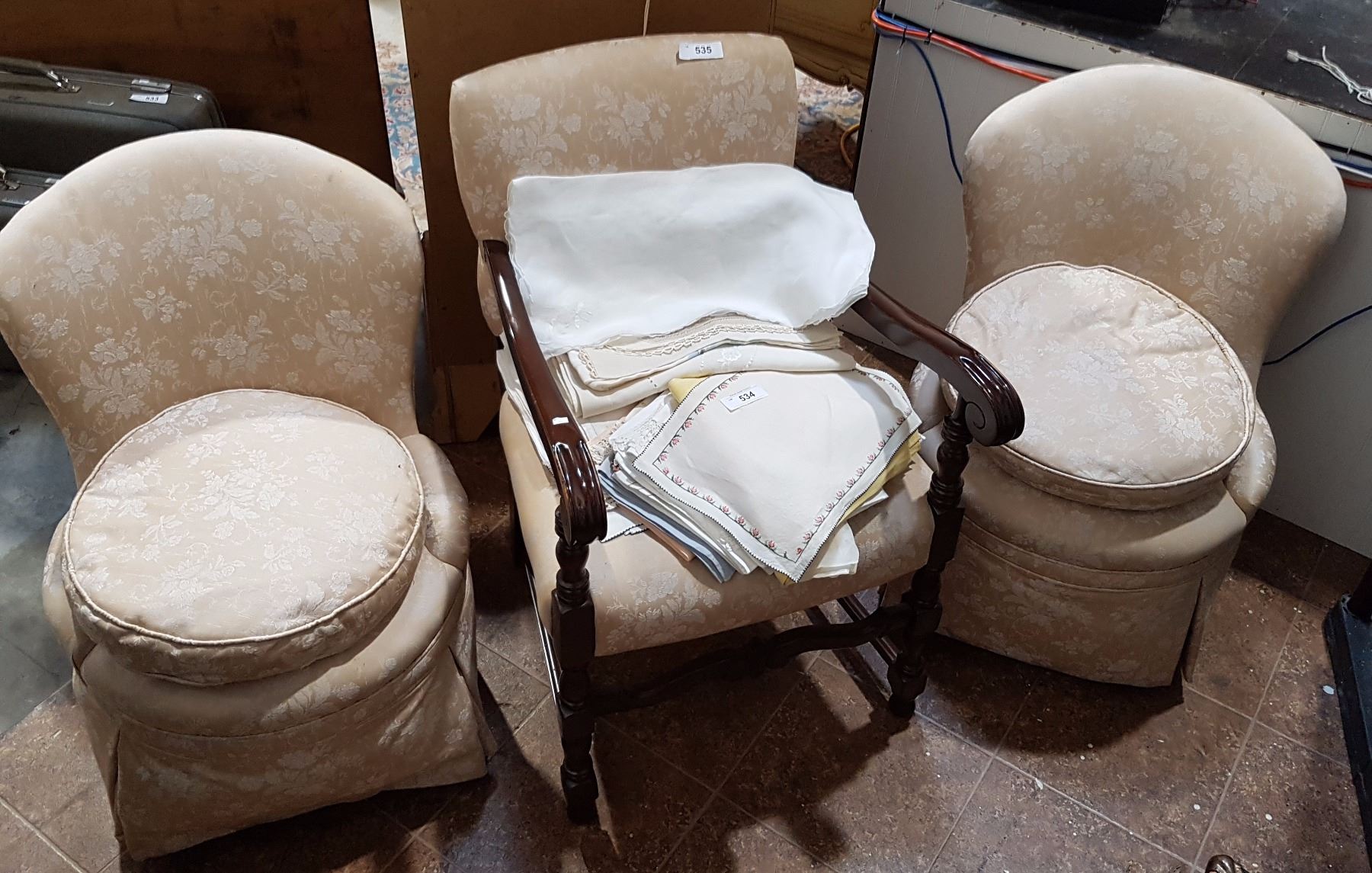 TWO SLIPPER CHAIRS AND ONE ARM CHAIR
