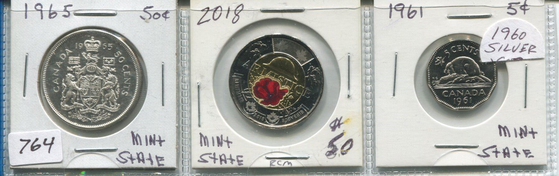 SET OF THREE CNDN PCS - 50 CENT PC (1965, SILVER), 5 CENT PC (1961) & 2 DOLLAR ARMISTICE PC (2018)