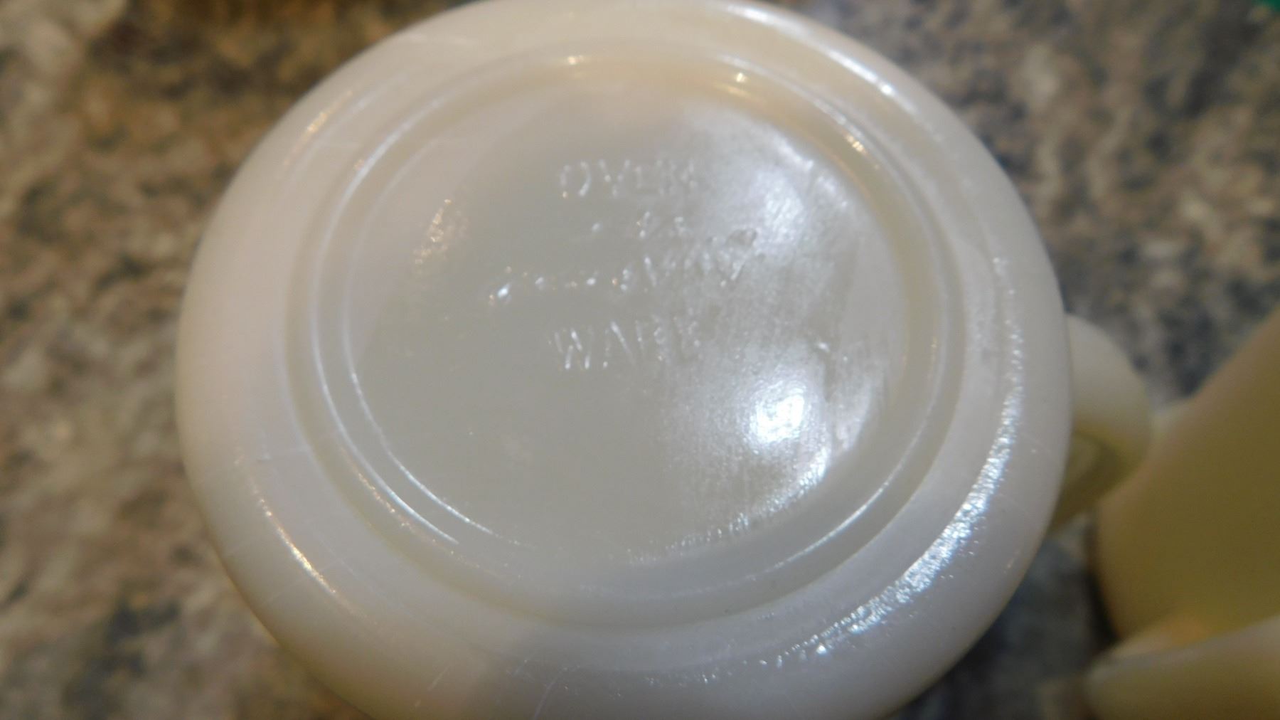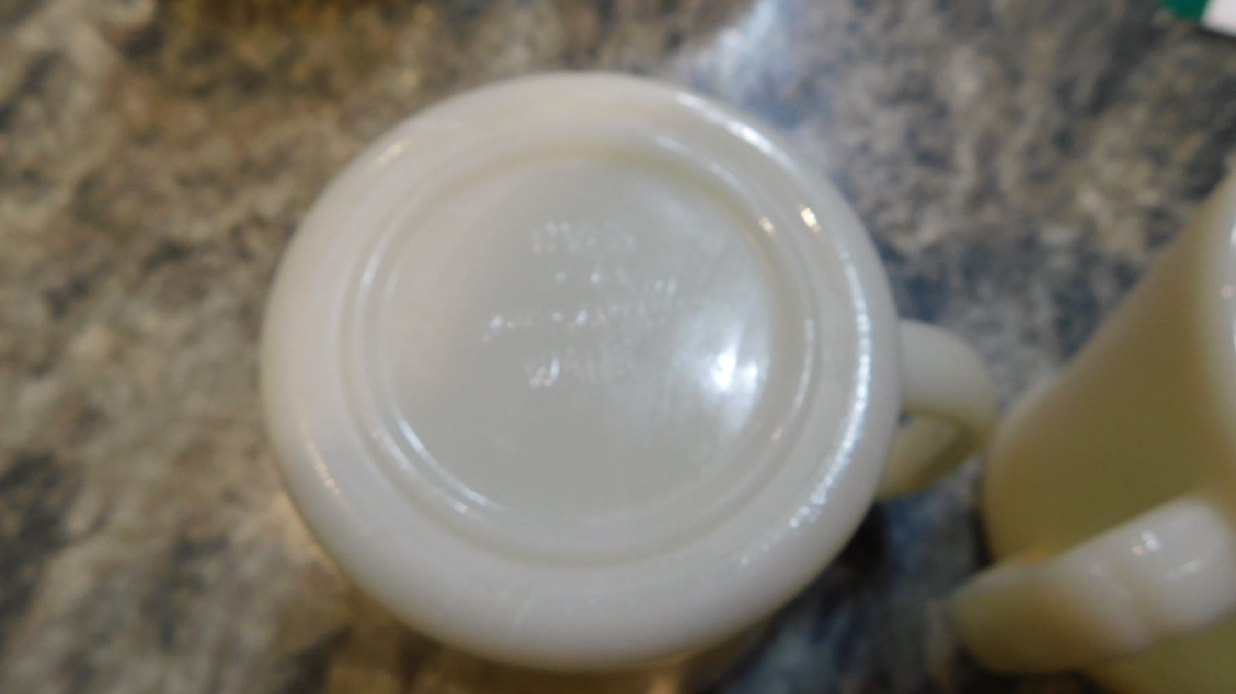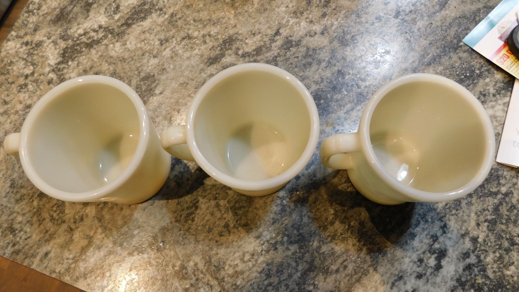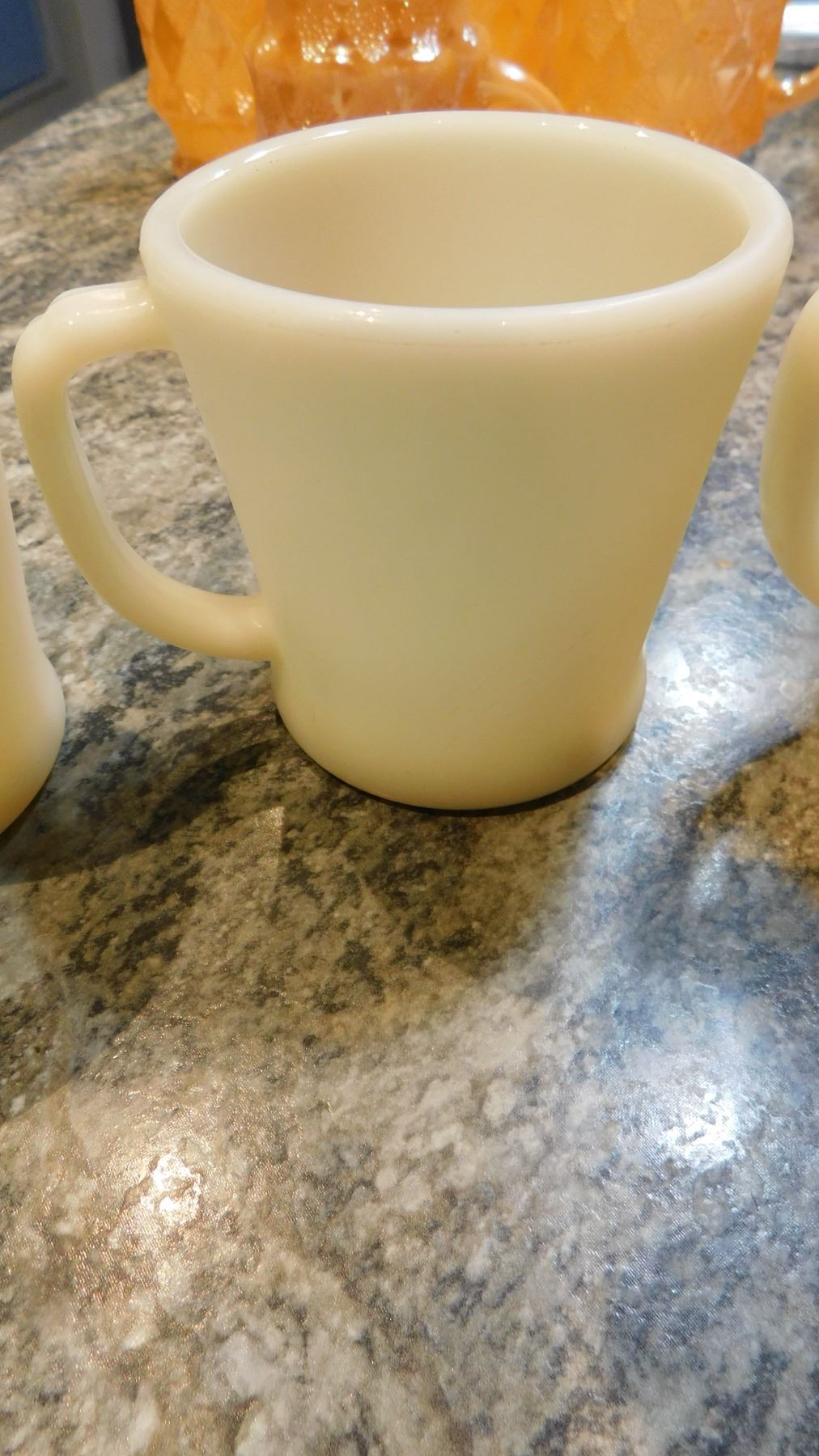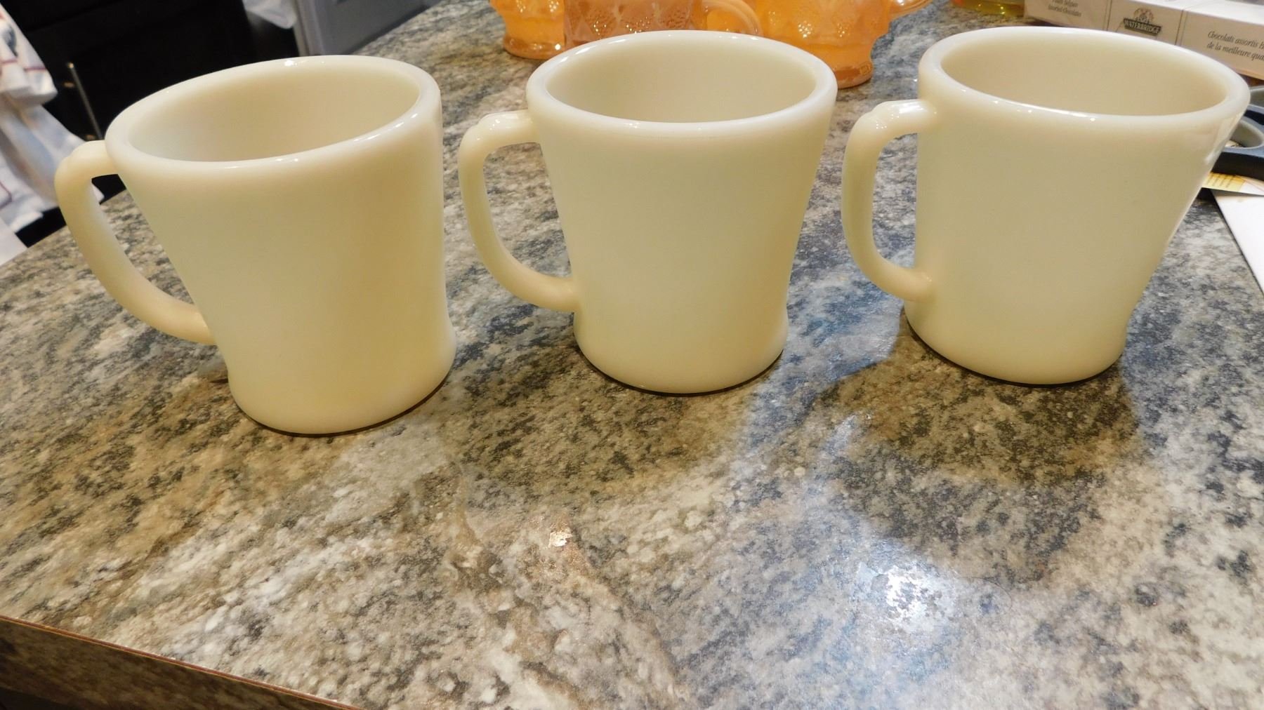 SET OF THREE, SCARCE, IVORY COLOURED, D HANDLE, FIRE KING MUGS