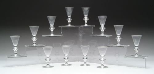 SET OF TWELVE STEUBEN LIQUEUR GLASSES. Each clear glass with knob center and cone shaped bowl has pontil mark signed Steuben. Each comes in an individual gray Steuben bag and fitted into an original box. SIZE: 4in. h. CONDITION: Very good. Box is as is. 9-26288