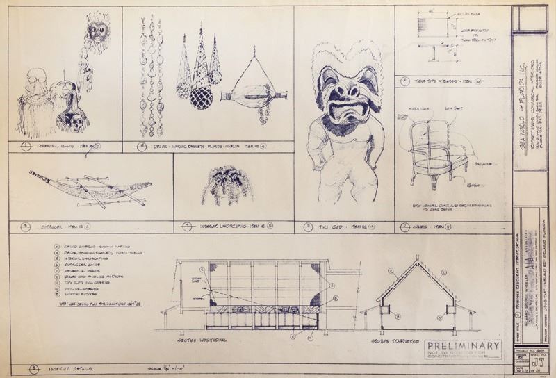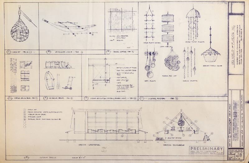 (1972) Blueprints for interior decor for the third expansion park for SeaWorld in Orlando, Florida. The architect, Richard George Wheeler and his team visited OA and picked out items to be incorporated into their plans and in turn looked to OA for fulfillment and on-site installation. The imagery includes nice Poly-Pop decor items and make for a nice display.23.5"x36"VG+ with minor wear and creasing