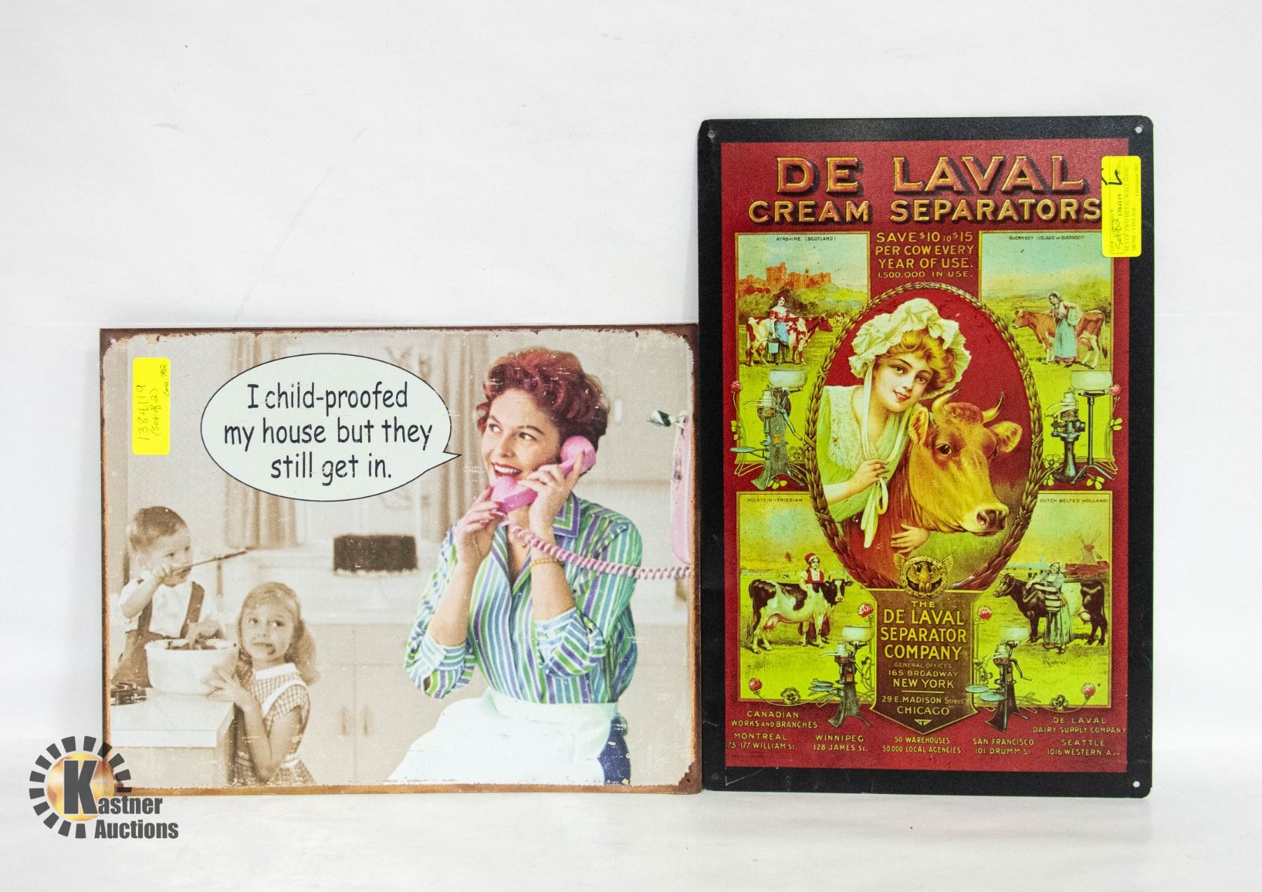 REPRODUCTION SIGNS - ADVERTISEMENT FOR "DE LAVAL CREAM SEPARATORS" SIGN (12"L X 17.75"H) AND "I CHILD-PROOFED MY HOUSE TODAY BUT THEY STILL GET IN" SIGN (16"L X 12.5"-TALL) **ALL ITEMS MUST BE REMOVED BY 5PM SATURDAY, FEBRUARY 8TH 2025. ALL REMAINING ITEMS WILL BE SUBJECT TO A $6.00 PER DAY STORAGE CHARGE. ANY ITEMS REMAINING AFTER MONDAY, MARCH 3RD 2025 WILL BE CONSIDERED FORFEITED. NO REFUNDS WILL BE ISSUED FOR FORFEITED ITEMS. TO SCHEDULE A PICK UP APPOINTMENT CLICK HERE
