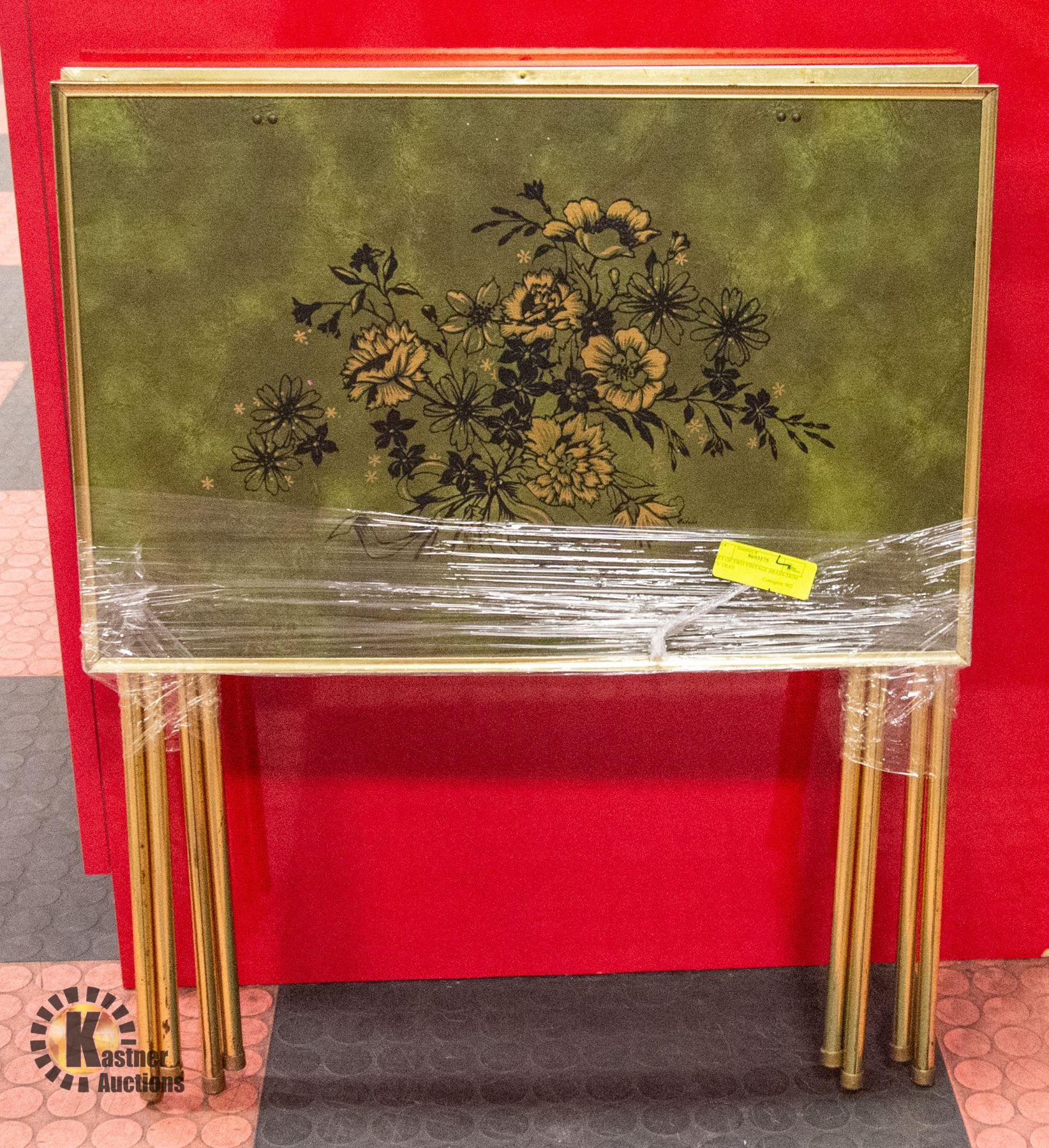 TABLES - FOLDS AWAY FOR STORAGE, AVOCADO/GOLD FLOWER PATTERN (15"W X 23"L (TRAY) X 24"H) **ALL ITEMS MUST BE REMOVED BY 5PM SATURDAY, JULY 29TH 2023. ALL REMAINING ITEMS WILL BE SUBJECT TO A $6.00 PER DAY STORAGE CHARGE. ANY ITEMS REMAINING AFTER MONDAY, AUGUST 14TH, 2023 WILL BE CONSIDERED FORFEITED. NO REFUNDS WILL BE ISSUED FOR FORFEITED ITEMS. TO SCHEDULE A PICK UP APPOINTMENT CLICK HERE
