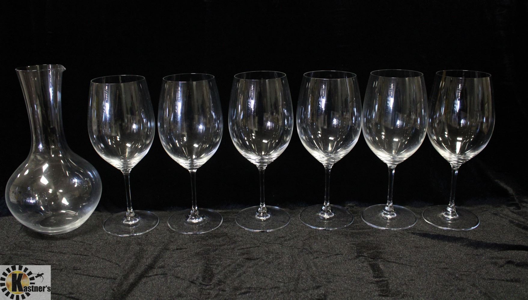 6 RIEDEL MARKED GLASSES AND MATCHING CARAFE