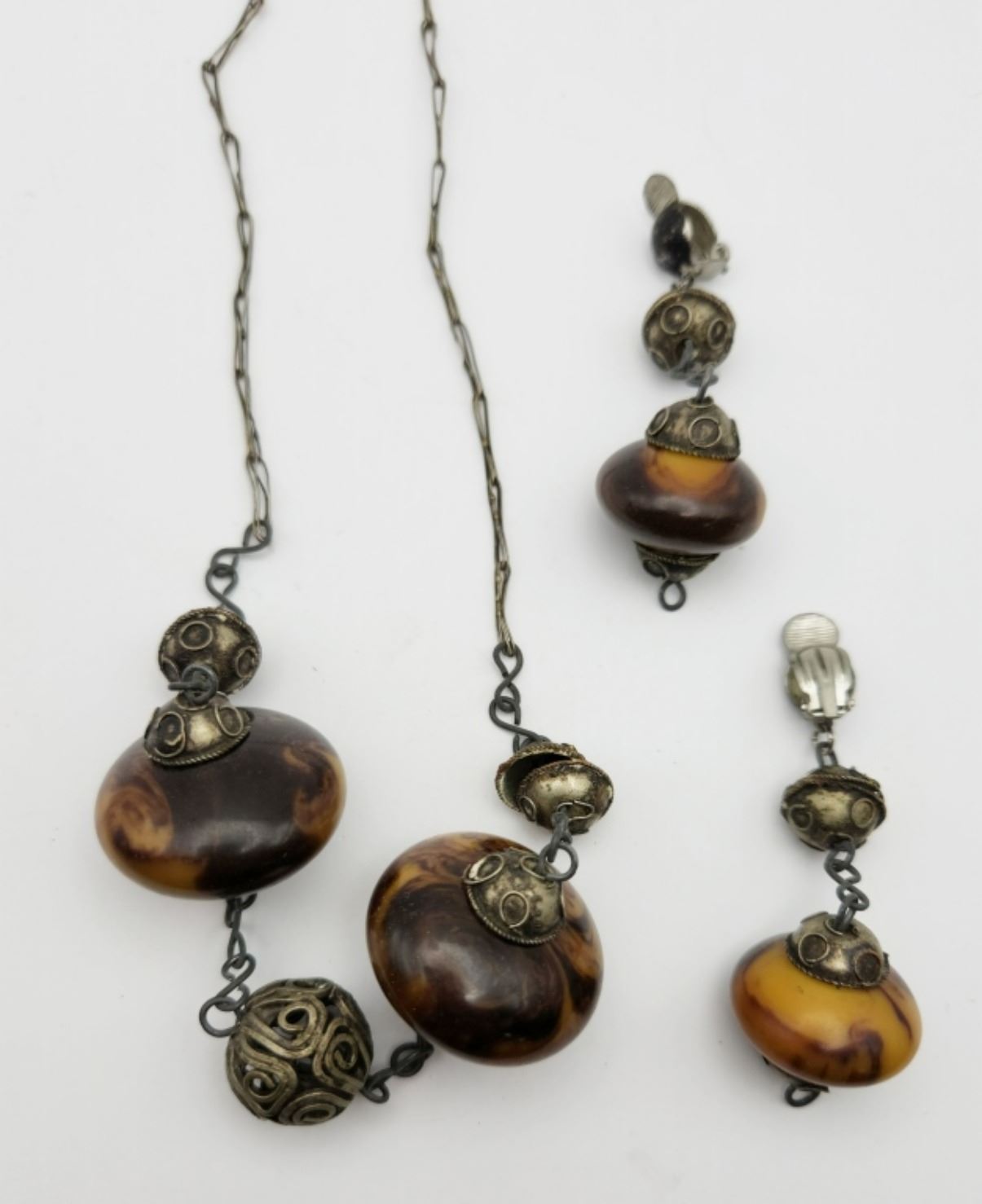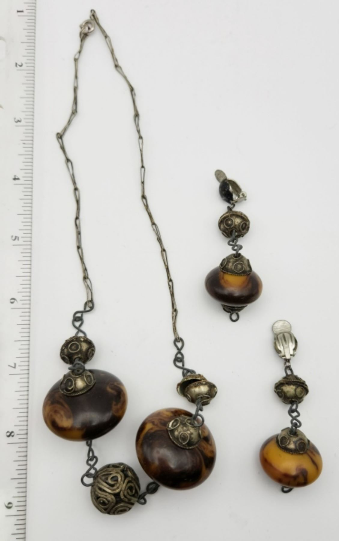 BROWN & YELLOW MARBLE LUCITE BEAD ACCENTS PLUS MATCHING PAIR OF CLIP ON EARRINGS-NECKLACE MEASURES 20 INCHES