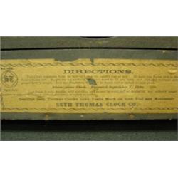 Seth Thomas Adamantine clock. Model 102. Dated 1896. 8-day. Embossed brass dial. Cast bezel and feet. Helmeted masks of Athena mounted at sides. Condition:
