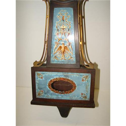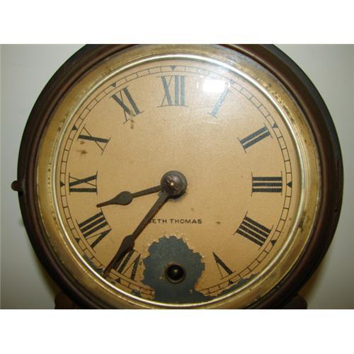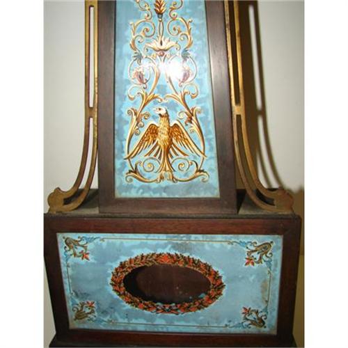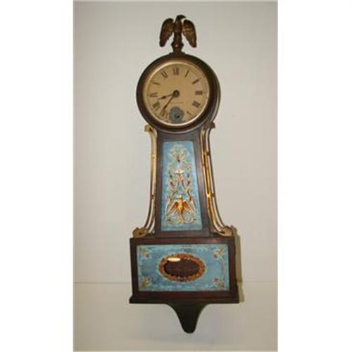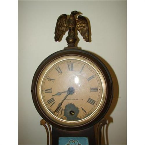SETH THOMAS BANJO CLOCK. Has two reverse painted glass panes decorated with flowers and eagle. Paper at clock face shows some loss. Has pendulum. 29.5" H