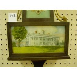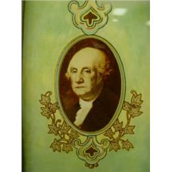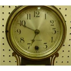 Seth Thomas banjo clock circa 1930. "Delaware" model. Mahogany case with Mount Vernon image on glass. George Washington bust on trunk. 29" tall, 9.5" wide and 4" deep. Condition: Some oxidation on bezel, otherwise very good. Key included.