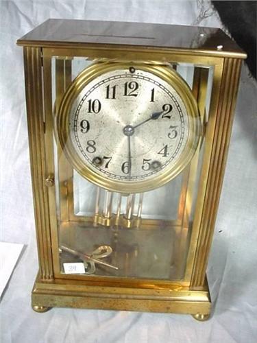 SETH THOMAS CRYSTAL REGULATOR WITH MOCK MERCURY PENDULUM. TIME AND STRIKE, EIGHT DAY. REEDED SIDE COLUMNS FRONT. 10"X6.5"X5". VALUATION: 795-895 USD.