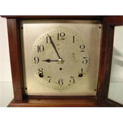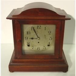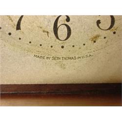 Seth Thomas mahogany mantel clock. Movement has been cleaned and oiled. Pivots have been polished and has new leather for strike. 9" H, 9.5" W.