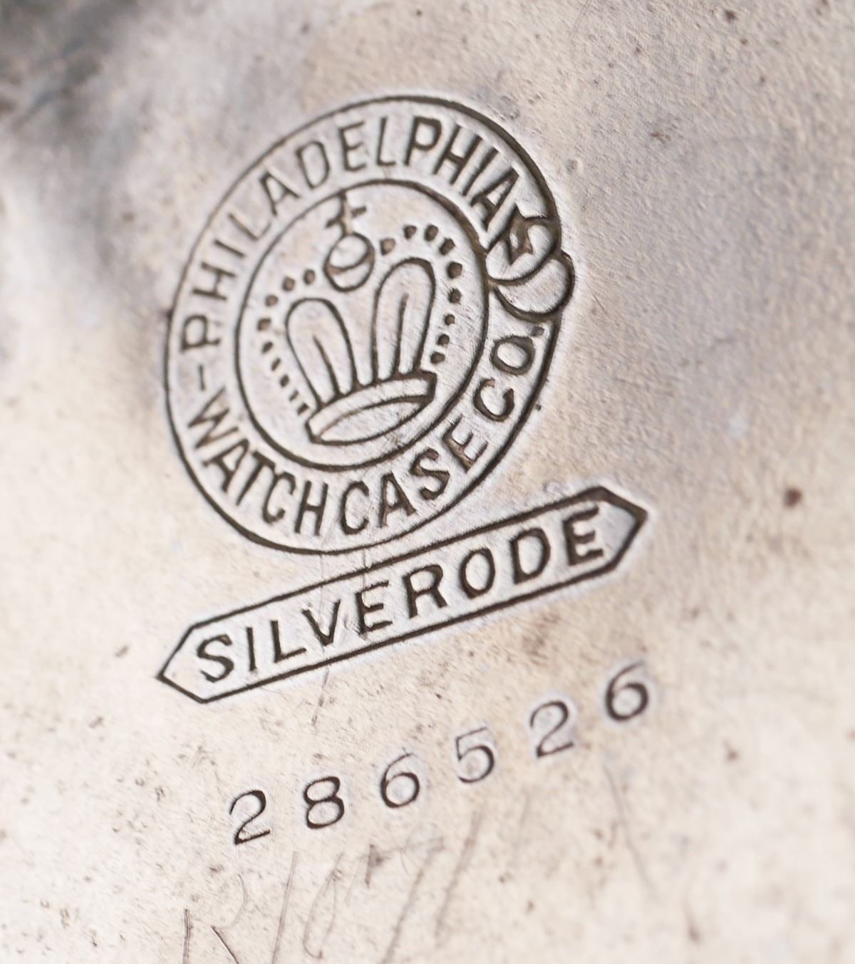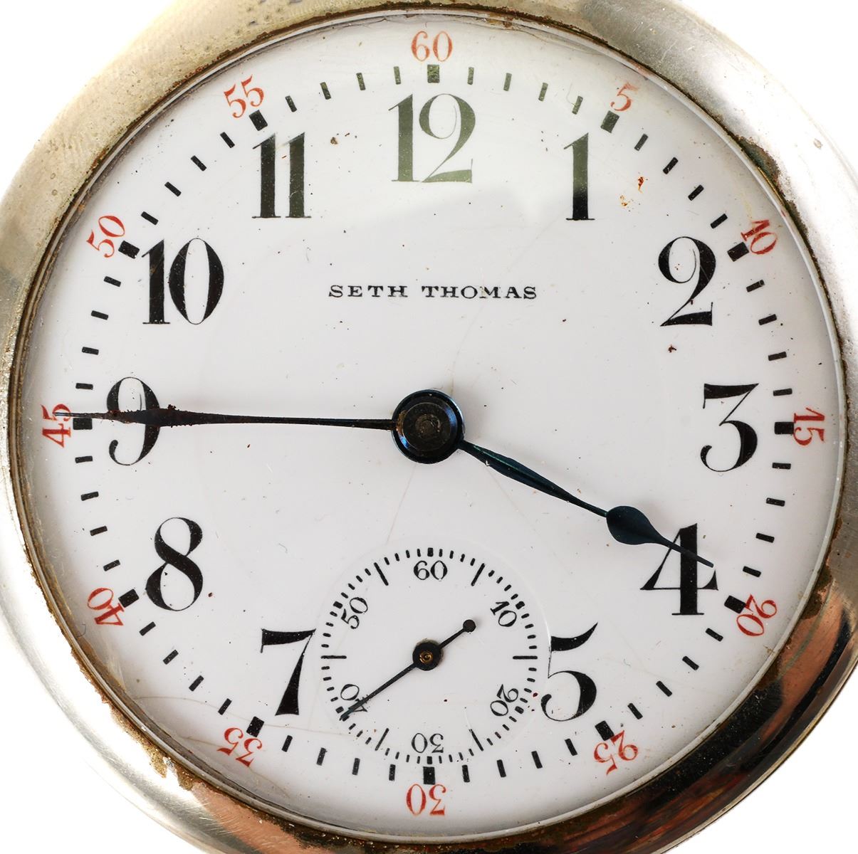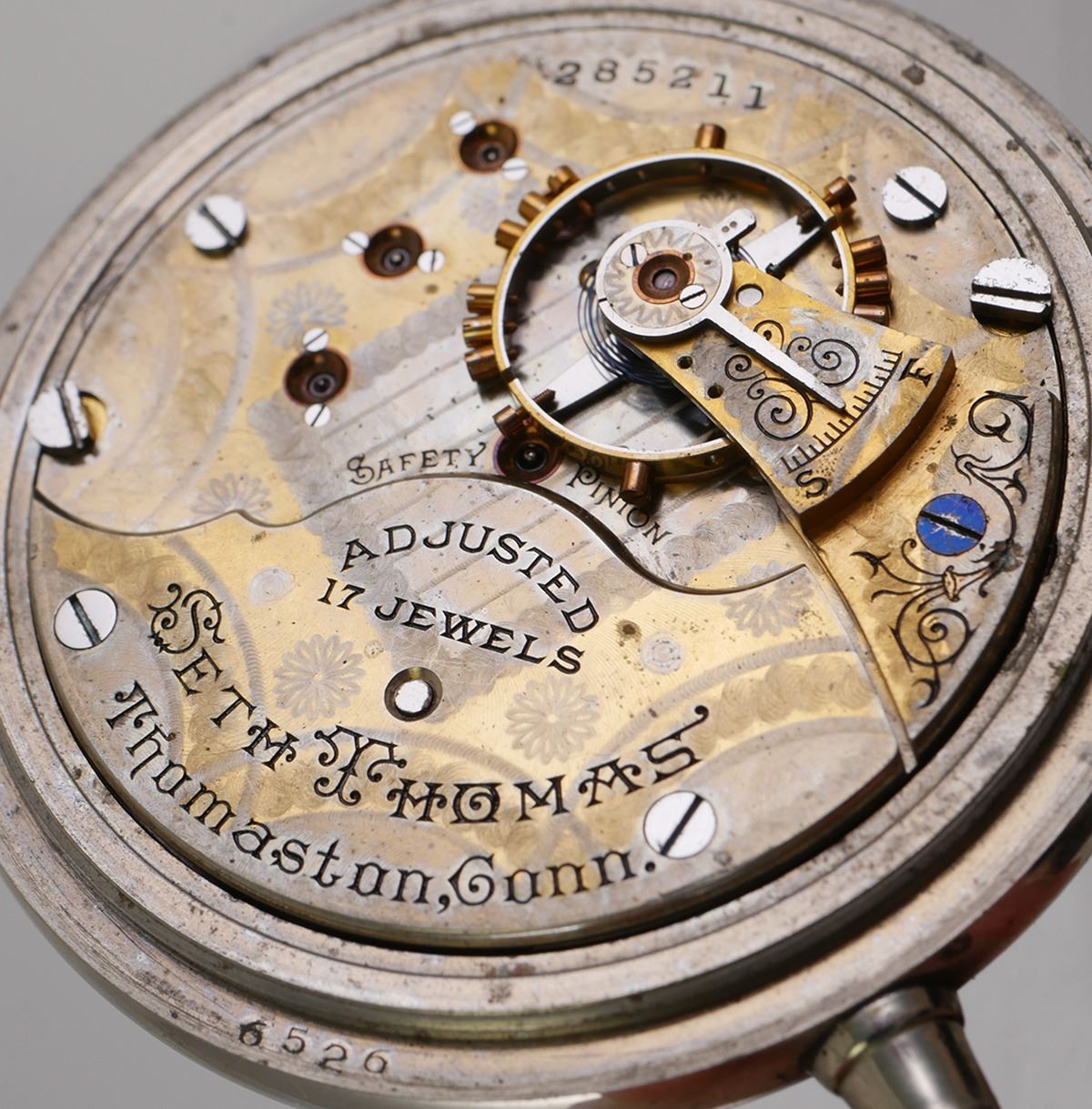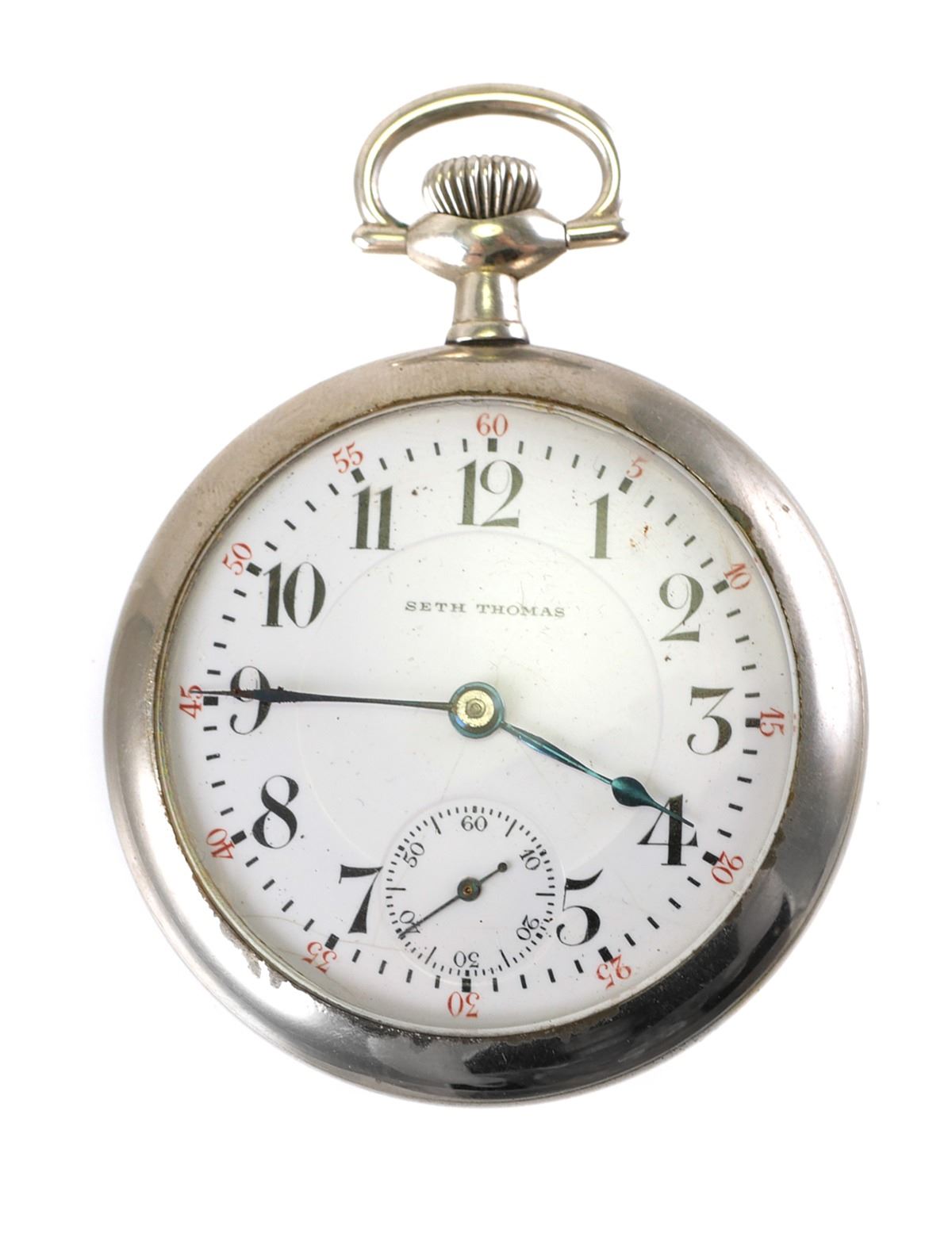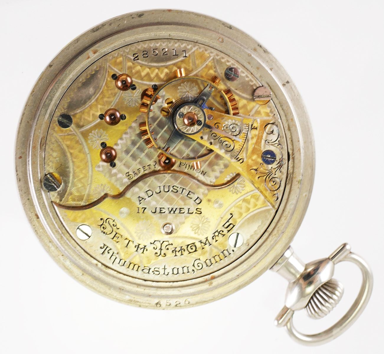 Vintage Seth Thomas open face pocket watch. Full plate 2 tone movement. Model 5, Grade 182. Pocketwatch is size 18s with 17j. Serial number 285211, circa 1893 to 1913. Plain case is marked Philadelphia Watch Case Co., Silverode and measures approx. 54mm. Overall weight is 110 grams. No monograms. Watch is in running condition but has not been tested for accuracy. Watch has general wear commensurate with age. See photos for more details on condition.