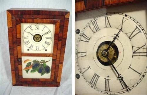 SETH THOMAS OF THOMASTON AND DAY COTTAGE BEVELED OG; THOMASTON LABEL WITH PLYMOUTH MOVEMENT LABEL AND SO TRANSITION 1865-1866 "KITCHEN" MODEL PAGE 269 V\TDL (TRAN FUY LY). TIME, STRIKE, AND ALARM; STENCIL LOWER GLASS ORIGINAL AND REASONABLE SHAPE; ZEBRA VENEER CASE. 15.5"X10"X3.75" VALUATION" 550-650 USD.
