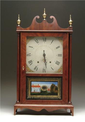 SETH THOMAS PILLAR AND SCROLL SHELF CLOCK. Fine mahogany case with brass finials and scroll top. Reverse painted scene of Colonial house with gazebo. Original painted dial with strawberries at center. Two winding holes with bell. SIZE: 32in. h x 17-1/4in. w x 4-1/2in. d. CONDITION: Very good. 9-25761