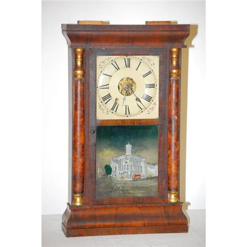 SETH THOMAS SPLIT COLUMN CLOCK - 8-DAY EMPIRE CLOCK W/ BRASS MOVEMENT & REVERSE PAINTING ON GLASS TABLET OF MERCHANT'S EXCHANGE (25" T X 15" W) - MISSING WEIGHT, WEAR, LOSSES, IMPERFECTIONS
