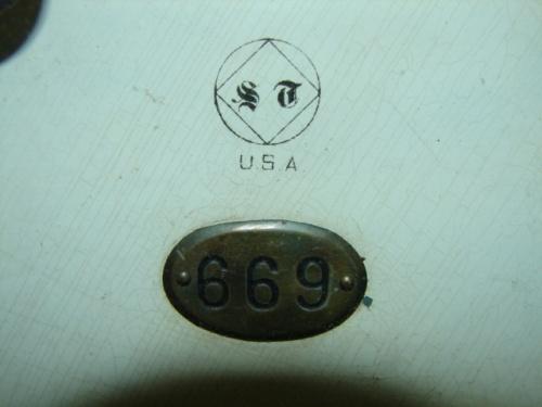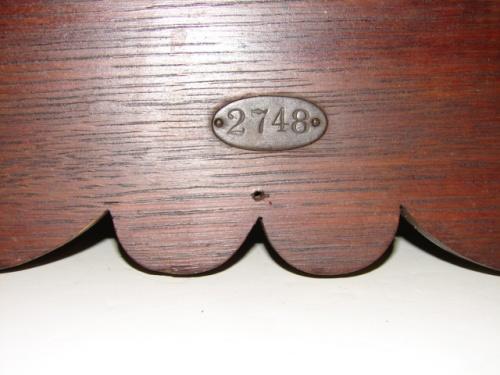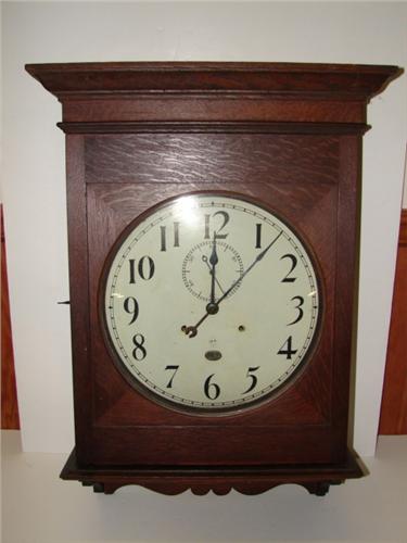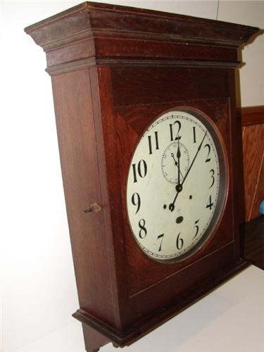 SETH THOMAS WALL CLOCK. Oak case. Key wound. Clock face is marked “ST” and has a metal plate that reads “669”. Metal plate at bottom of case reads “2748”. Inspectors label on inside is dated May 1910. Clock is from a rail road station in Salisbury, Maryland. 30.5” H, 21.75” W