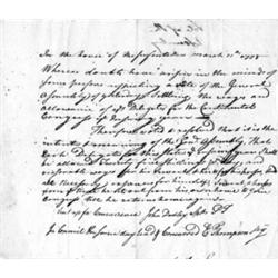 <b>506. SETTING PAY FOR CONTINENTAL CONGRESSMEN </b> Important manuscript document, 1p. oblong 4to., [Boston] Mar. 11, 1778, a copy of a legislative bill setting forth the pay for Massachusetts delegates to the Continental Congress. In part: "<i>...Whereas doubts have arisen in the minds of some persons respecting a vote of the General Assembly of yesterday settling the wages and allowance of the Delegates for the Continental Congress the ensuing year. Therefore voted & resolved that it is the intent & meaning of the Genl. Assembly that each delegate for this State the ensuing year shall be allowed twenty five shillings pr day, and reasonable wages for his servants, & hire for his horses and all necessary expenses for himself, Servant, & horses for the time he sets out from his own home to join Congress till he returns home again, Sent up for Concurrence John Dudley, Spker, in Council the same day, read & concurred E. Thompson</i>...". Very good.<b>$750-1,000</b>7732