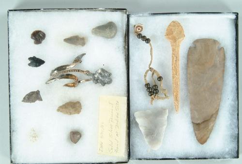 SEVEN CASES OF INDIAN ARTIFACTS. 1) Small fluted point labeled Cumberland River, Bell County. 2) Two possible Paleo tools. 3) 5in. stone drill. 4) 22 Western style gem points. 5) Glass trade beads, dovetail and triangular knife. 6) Shell beads, banded slate gorget, glass trade beads, corner notch projectile point of Knox chert. 7) Small arrowheads and metal object labeled ""Solid Silver Pendant found at Indian Site"". CONDITION: Fair to very good. 9-25984-185 The Tennessee Collection of Prehistoric Indian Artifacts from the Allen Graves Estate. SPECIAL NOTE: We do not regularly sell Prehistoric Indian stone artifacts and therefore have very little experience and no expertise in this area. All of the following lots have come from the Collection of the Late Allen Graves of Tennessee. The collection was inherited some years back by his daughter, who now lives in Maine. This collection was consigned to us directly from her. We employed someone to generally identify styles and types, but as stated above, due to our lack of expertise in this field, we can not guarantee the age or origin of the following pieces. We are relying on you, the buyer, to determine to your satisfaction the origin and age of each item in the collection.