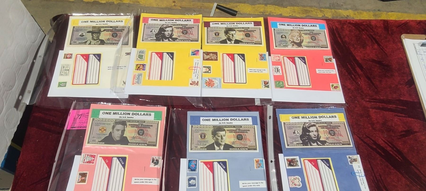 SEVEN COMEMERATIVE ONE MILLION DOLLAR BILLS AND A COLLECTION OF STAMPS