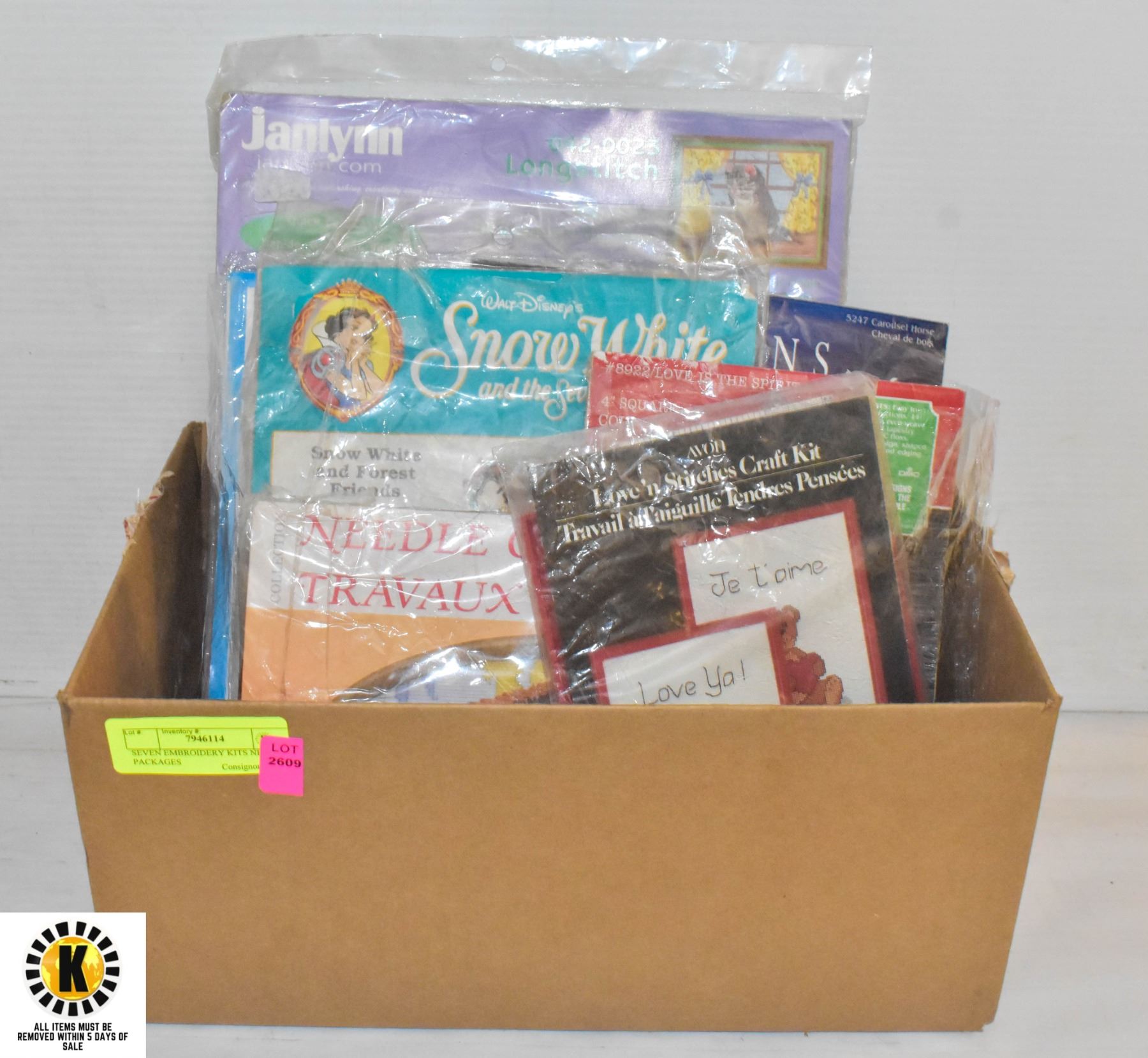 PACKAGES ALL SEALED AND CONTAIN PATTERNS, EMBROIDERY THREADS, NEEDLES, ETC.