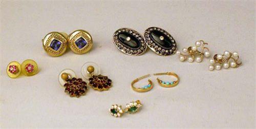 Comprising a pair of flora form earrings with teardrop shaped green stone and small diamond, a pair of 925 sterling gold wash earrings with small amethyst stone, marked China, a pair of 14K yellow gold small pearl earrings, stamped 14k, screw backs, a pai