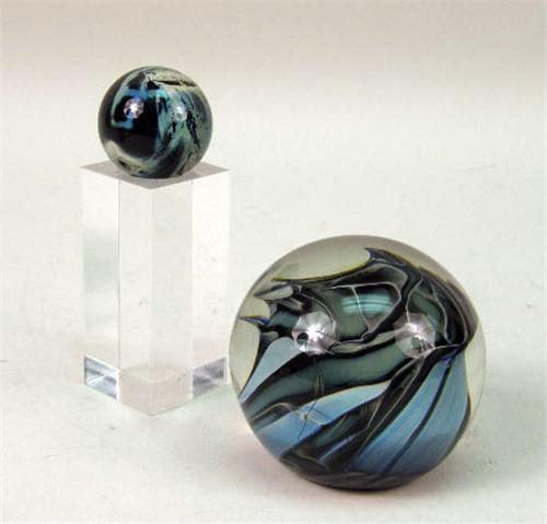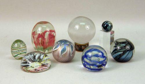 One an "Andy Warhol", one signed and dated "R. Strong 7/78 #1129", one signed "Vandermark"(?) #21/1979. Together with a crystal ball and an enameled Chinese ring stand. 8 pieces.