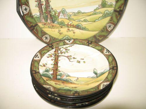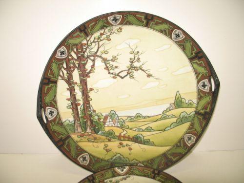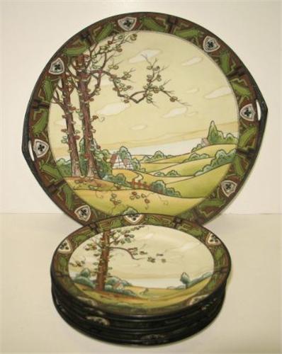 SEVEN PIECE NIPPON LUNCHEON SET. Consists of one double-handled tray and six small plates. All are decorated with hand painted scene of landscape with hills, trees, and houses. Border and landscape scene are also enameled decorated. All are marked on bottom with green Nippon wreath mark. Tray: 10” Dia. Plates: 6.5” Dia.