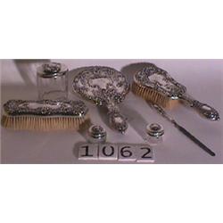 SEVEN-PIECE STERLING SILVER VANITY SET, late 19th century, includes mirror, hand brush, clothes …