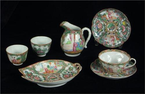 PORCELAIN: Seven pieces of Rose Medallion Chinese Export porcelain with figural depictions purchased in Shanghai in 1929. Also included in the lot is a small leaf form condiment dish with a beaded edge and a reticulated handle measuring 7 1/4''L x 5 1/4''W, a creamer with a bamboo form handle measuring 4 1/2''H, two teacups without handles measuring 2''H x 2 3/4'' diameter, a teacup with a handle and a scalloped rim and two matching saucers also with scalloped edges. The teacup measures 3 3/4'' diamter x 2''H and the saucers measure 5 1/2'' diamter. No chips or cracks noted, however, some fading noted to figural scenes.