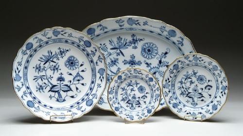 SEVEN PIECES OF MEISSEN IN THE "BLUE ONION" PATTERN. Each piece with gold edge and blue cross sword mark. Lot consists of: 20-1/2in. x 14-3/4in. platter; Two 13-3/4in. dia round trays; Two 10in. dia plates; Two 8in. dia plates. CONDITION: Very good. 9-26336