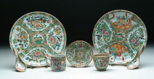 SEVEN PIECES OF ROSE MEDALLION ORIENTAL EXPORT CHINA. Lot includes two 9-1/2in. plates; two 5-1/2in. rice scoops; 4-1/2in. saucer; 2-1/2in. h cylinder cup and 2-1/2in. h teacup. CONDITION: Very good. 9-26019