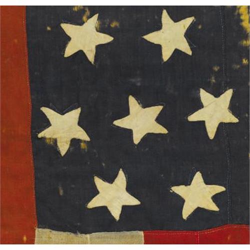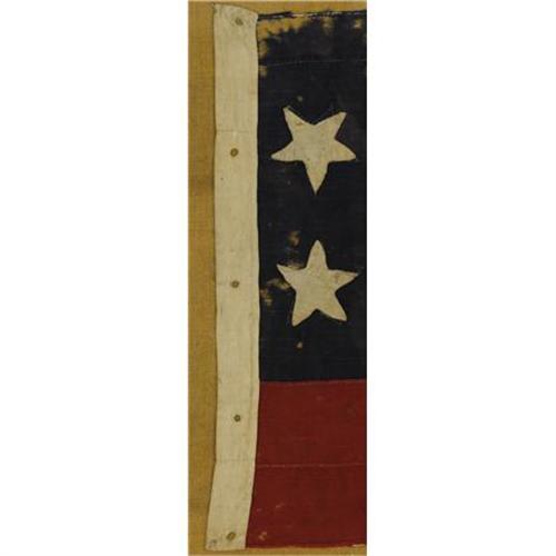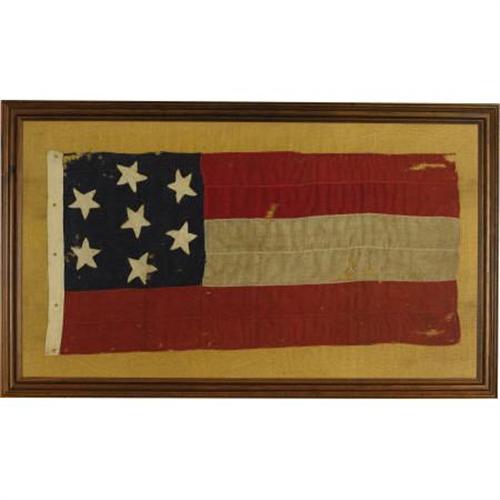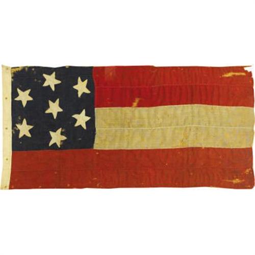 <B>SEVEN STAR EARLY WAR CONFEDERATE FIRST NATIONAL FLAG.</B></I> Pre-dates April 17, 1861 when Virginia became the eighth state to secede. Body of the flag is of wool bunting. Six white cotton 4” stars are arranged in a circle with the seventh star in the center, double sided. The 2 ¼” white cotton hoist has five grommet holes reinforced with hand stitching. The flag is 28” on the hoist and 57” on the fly including the hoist. Each stripe is constructed of two strips. Completely hand stitched. The body of the flag, excluding the hoist is bound with a thin stitched in white cotton cord. A very nice early Confederate first national flag laden with character and in a very desirable size. <BR><B><BR>Provenance:</B></I><I> Chicago Historical Society dexecessed to Arnold Chernoff.</B></I><B><BR><BR>Condition: </B></I>All colors bright and all of the white cotton hand stitching is tight. Some minor spots of damage scattered about, most notably on the corners of the fly and the blue field at the hoist. Very sound and has been nicely mounted and framed for presentation.<BR><BR>This flag has been carefully examined by authoritative in-house experts and has been deemed to be authentic and of the period in every respect including fabric, thread, dye and the method and pattern of construction. Additionally, any accompanying provenance has been verified as unique and indigenous to the specific flag it documents.<BR><BR><b>Shipping:</b> Framed - without Glass, Large (<a target="_blank" href="http://www.heritageauctions.com/common/shipping.php">view shipping information</a>)