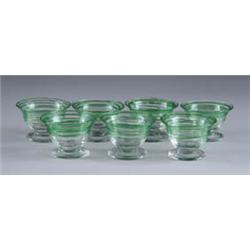 Lot 418 SEVEN STEUBEN SALTS Footed pedestal salts of clear glass with green threading. Four signed “Steuben”. SIZE: 1-1/2” t x 2-1/4” w. CONDITION: Very good. 5-70342