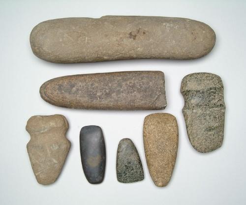 SEVEN STONE TOOLS. Archaic through Mississippian, Circa 5000BC style - 1500AD style. Includes one complete roller pestle, one broken roller pestle, three celts, one full grooved axe, one 3/4 grooved axe. Materials of slate, granite, diabase. SIZE: Largest is 13-1/2in. l x 4in. w. Smallest is 3-1/4in. x 2in.. CONDITION: As noted above, very good. 9-25984-28 The Tennessee Collection of Prehistoric Indian Artifacts from the Allen Graves Estate. SPECIAL NOTE: We do not regularly sell Prehistoric Indian stone artifacts and therefore have very little experience and no expertise in this area. All of the following lots have come from the Collection of the Late Allen Graves of Tennessee. The collection was inherited some years back by his daughter, who now lives in Maine. This collection was consigned to us directly from her. We employed someone to generally identify styles and types, but as stated above, due to our lack of expertise in this field, we can not guarantee the age or origin of the following pieces. We are relying on you, the buyer, to determine to your satisfaction the origin and age of each item in the collection.