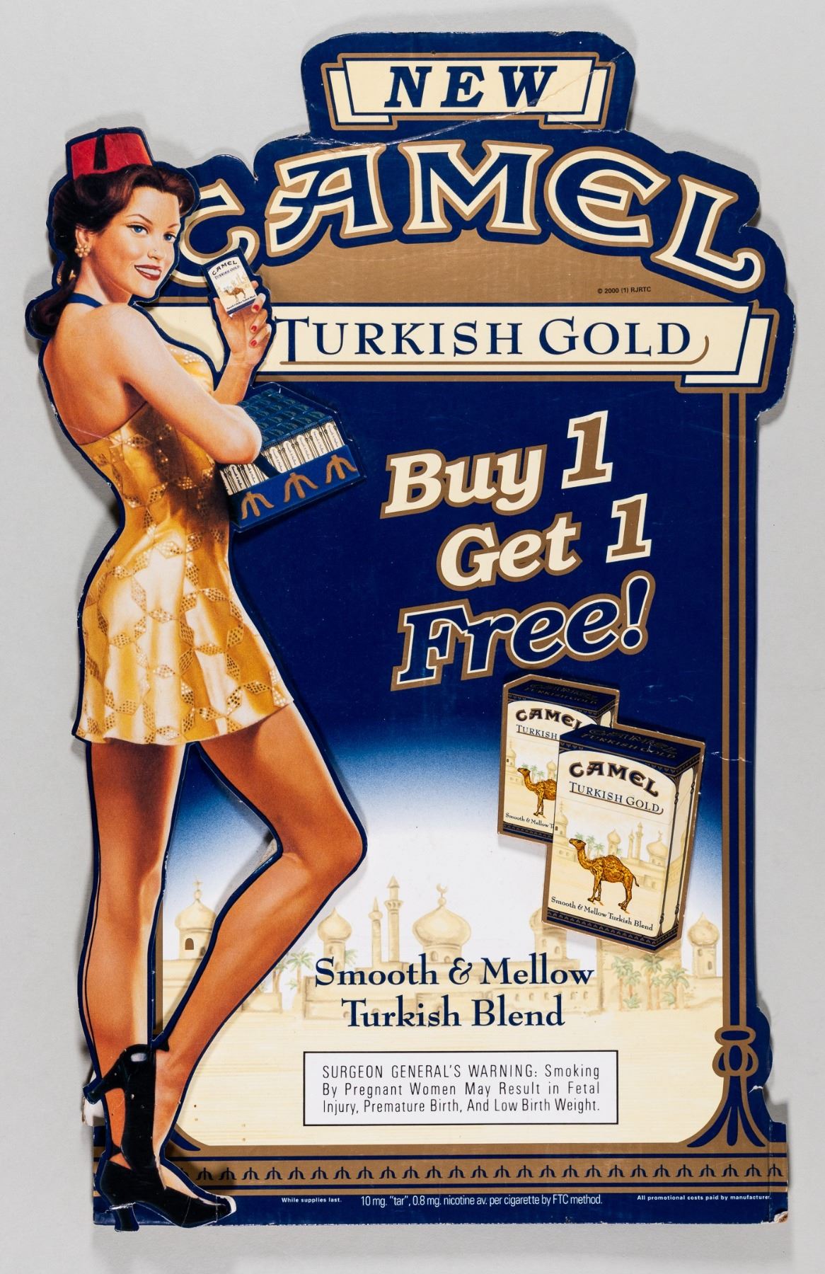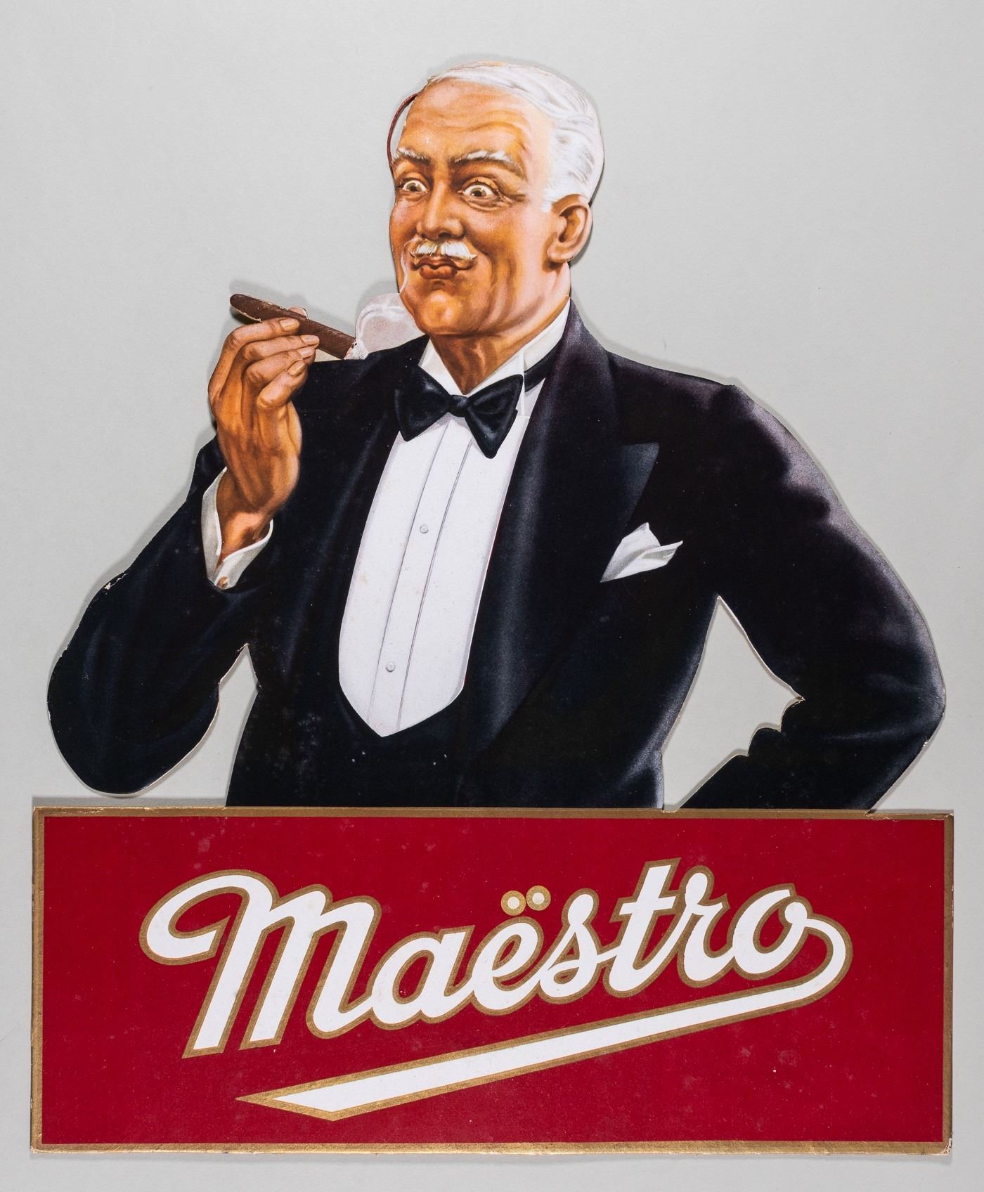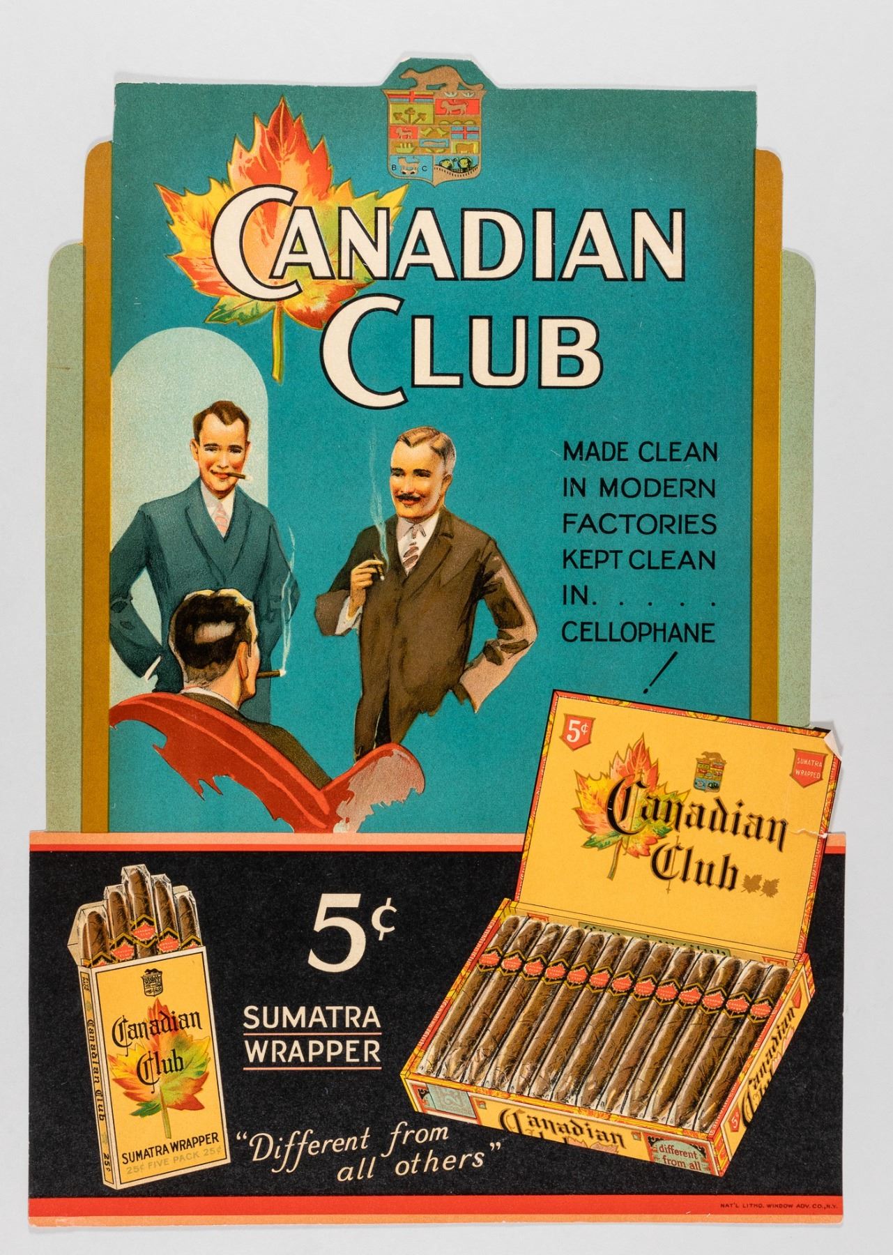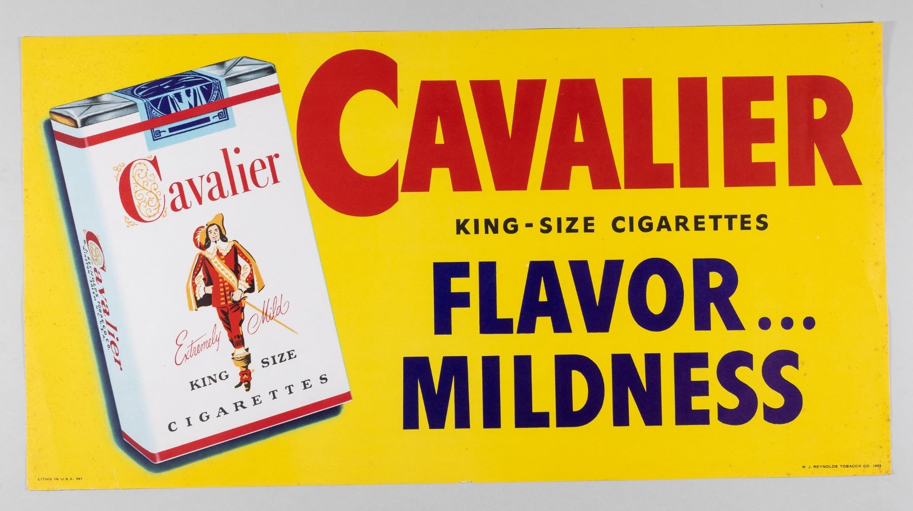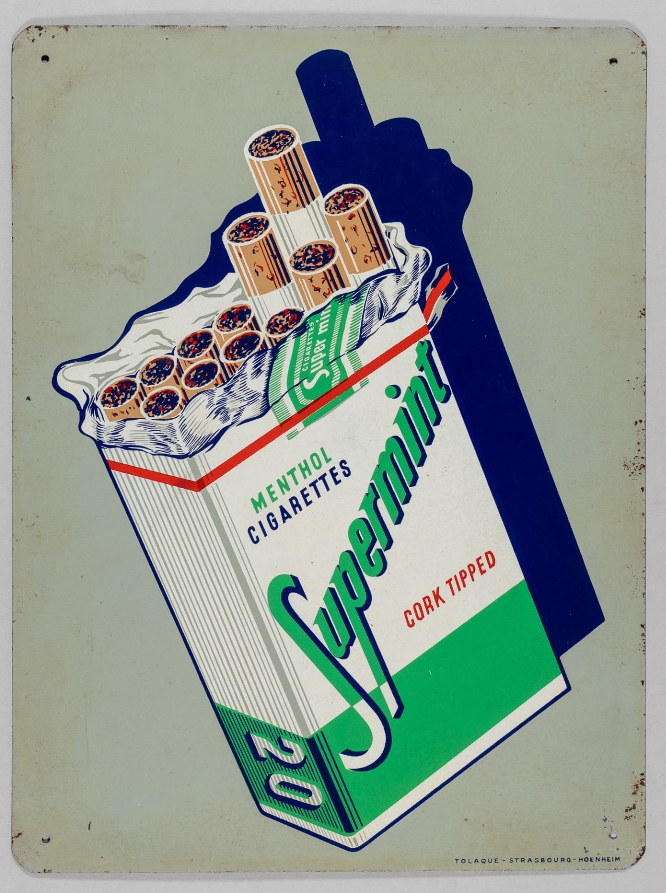 Seven vintage smoking advertisements made by Cruwell Tobacco, Co., Camel, Cavalier, Canadian Club, Supermint, Epco Cigars, and Maestro. The advertisement cards date from 1912 to 1953, with the Camel advertisement being dated 2000. Supermint is an enameled sign. Cruwell, Camel, and Maestro have cardboard backing. Cavalier, Epco, and Canadian Club are paper. Various sized tears and wear.