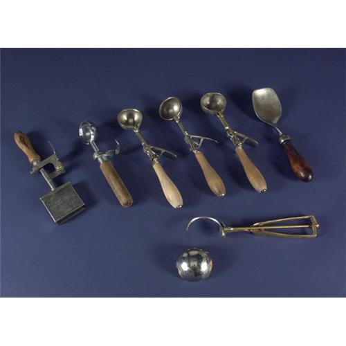 A collection of seven vintage ice cream scoops to include three Gilchrist N31 scoops with one showing signs of repair, 11'' length. A brass handled ''Dairy Fresh'' scoop, 10''L, scoop seperated from handle. A patinated unattributed paddle scoop, 10'', metal collar loose on handle. An Arnold N#50 vintage scoop, 9'', denting and scratching to scoop. And a McLaren's square ice cream sandwich scoop, 10''.
